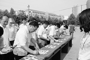为贯彻落实省市开展“能源紧缺体验日”活动安排的通知,努力提高全社会资源紧缺意识和节能意识,日前,郸城县在县世纪广场启动了节能宣传周暨能源紧缺体验日活动。图为社会各界群众在节能倡议宣传条幅上签名。(记者 卢好亮 通讯员 丁宇涛 摄)
