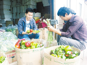 图一:社员正在分装蔬菜;图二:马伟国察看黄瓜长势。(记者 刘彦章 摄)