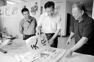 6月25日,中国书法家协会会员、周口市书法家协会副主席刘伟将他5月份参加马来西亚中国书画名家邀请展的12幅得意之作无偿捐赠给周口报业书画院,展现了一位本土书法家热爱家乡的情怀。他希望周口书画名家的精品能通过周口报业书画院这个平台走出河南、走向全国,为家乡争光。(记者 李伟 摄)