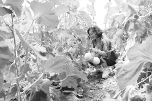 黄泛区农场郭庄村部分村民大棚种植有机小西瓜、甜瓜取得良好效益,每个大棚两亩左右,年纯利润20000多元,吸引了周口、漯河等地市民前来采摘、购买。图为村民尹大娟家的大棚里,市民在观光、摘瓜。(钱国顺 宁志广 摄)
