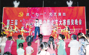 为了庆祝“七一”建党节,近日,鹿邑县青少年学生在该县的弘道苑文化广场表演文艺节目,歌舞、相声等十多个精彩的节目赢得了市民们的阵阵掌声。这也是该县文化系统“百城万场”广场文化活动的一部分。王巧荣 蒋保庆 摄