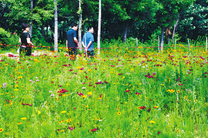昨日,几名游客在周口公园漫步赏花。周口公园今年3月份从北京林业大学引种近5000平方米的花草组合,其中盛开的波斯菊、金鸡菊等格外吸引眼球。(记者 沈湛 摄)