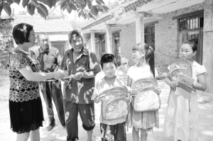 扶沟县妇联开展“千名妇女干部进千村”关爱特困儿童活动。截至目前,全县已组织动员社会爱心单位和个人向特困儿童捐款5万余元,捐赠学习用品和儿童用品300多件。图为该县妇联人员到练寺镇直沟河村看望特困儿童,并为他们送去学习用品。