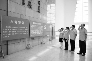 右图:6月28日,扶沟县工商局机关在职党员冒着酷暑到吉鸿昌纪念馆参观,缅怀革命先烈的丰功伟绩,进行爱国主义教育,隆重庆祝党的生日。(记者 王泉林 通讯员 卢付昌 摄 )