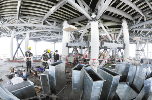 昨日,几名工人在市广播电视塔工作台面上作业。据了解,该塔占地54.6亩,建筑面积8408平方米,总高度286米,目前已进入内部硬件安装和防火处理阶段。(记者 沈湛 摄)