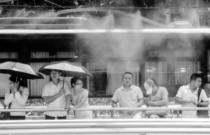 杭州:公交站喷雾送清凉 7月4日,乘客在杭州灵隐公交站的喷雾下等车。 近日,杭州天气晴热高温,杭州灵隐公交站启用喷淋降温系统改善乘客候车环境。该系统将水进行雾化处理,以达到降温、保湿等效果。据介绍,该系统运行时喷雾范围内气温能降低5摄氏度左右。新华社记者 韩传号 摄