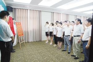 7月1日上午,项城市电业局17名新党员面对党旗,庄严地举起右手宣誓,光荣地加入了中国共产党,向党的92岁生日献礼。 杨光林 朱培波 摄
