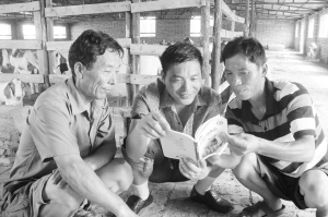 商水县以“下基层”活动为契机,积极开展送技术、送信息、送项目、送资金、送温暖为主的“六送”活动,全县很多农户依靠特色种养走上了发家致富之路。图为平店乡干部正在刘营村广领波尔山羊养殖场送书并做技术指导。(赵永昌 摄)