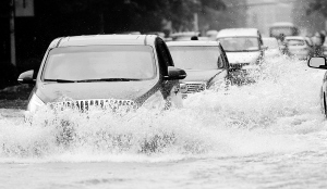 武汉遭遇暴雨 市区多处积水 7月7日,汽车从积水路段驶过。从7月6日晚至7日,武汉遭遇5年来最强暴雨,武汉中心气象台连续发出多次暴雨红色预警,城区多处路段形成积水。 新华社记者 程敏 摄
