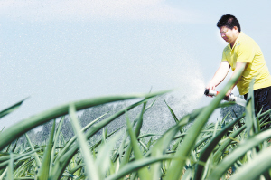 7月9日,商水县郝岗乡农民在为玉米浇水。眼下,该县农民积极开展以化学除草、施肥提苗、防治虫害为主的苗期田间管理,为秋粮丰收打好基础。(吕耀光 魏红 摄)