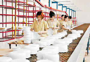 河南金丹搪瓷有限公司生产车间一瞥。该公司现有员工1000多人,其中工程技术人员208名,目前已取得自营进出口权,并荣获中国轻工业搪瓷行业十强企业、中国搪瓷行业优秀出口企业等称号。(记者 沈湛 摄)
