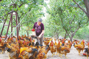 7月6日,项城市李寨镇熊庄村的养鸡专业户正在给“绿色鸡”喂食。该镇群众充分利用当地桃林面积大、空气清新、虫子丰足等资源优势,大力发展绿色生态养鸡养殖,使这里的绿色鸡、鸡蛋供不应求,使养殖户很快走向致富路。(赵献伟 摄)