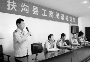 近日,扶沟县工商局举办了以“学习先进,爱岗敬业”为主题的第六期“道德讲堂”活动,通过唱歌曲、看短片、学模范等活动深入学习实践雷锋精神。活动邀请了本系统创先争优先进典型代表作了先进典型事迹报告。(记者 王泉林 通讯员 卢付昌 摄)