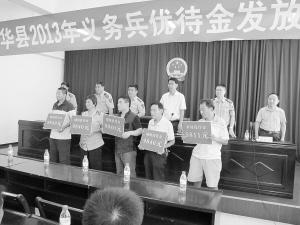 7月16日上午,西华县隆重召开2013年义务兵优待金发放大会,全县军属代表喜领优待金。