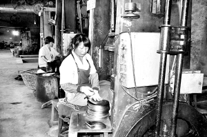 日前,两名工人在压模机前认真操作。有着近40年历史的河南金丹搪瓷有限公司注重对员工的技能培训,该公司现有工程技术人员208名,占所有员工的四分之一。(记者 沈湛 摄)
