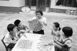 近日,几名农村留守儿童在“代理妈妈”程爱红指导下学习剪纸。暑假期间,县妇联、县计生协等单位积极开展“代理妈妈牵手留守儿童”活动,让农村留守儿童接受科技、文化、艺术等方面的教育,也给他们带来了温馨和欢乐。(记者 岳建辉 通讯员 刘飞 魏红 摄)