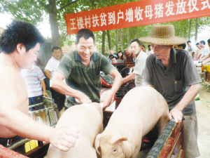 7月25日,项城市扶贫办工作人员在孙店镇王楼行政村为贫困户发放母猪。近年来,项城市扶贫办依托项目对贫困群众开展送猪、送技术服务活动,帮助困难群众脱贫致富。(赵献伟 崔建平 摄)