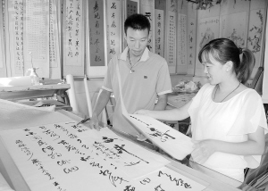 近段时间,鹿邑县文化部门依托县文化馆、乡镇文化站,不断加大对基层文艺人才的培训力度,指导帮扶文化产业创业项目,拉长文化产业链,有力地推动了当地“两个文明”建设。图为鹿邑县高集乡李矬庄青年农民季军旗正在装裱字画。王广丰 蒋保庆 摄