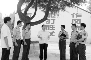 7月24日,扶沟县人民法院工作人员来到县武装部开展送法进军营活动。连日来,扶沟县人民法院采取召开座谈会、奉献法制课、送上慰问金、赠送法律书、提供法律咨询等方式,切实提高涉军维权工作质量,以实际行动庆祝“八一”建军节的到来。图为法院工作人员在县武装部提供法律咨询的场景。