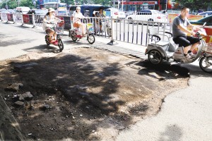 八一大道与七一路交叉口往南30米西慢车道路面损毁,有一大块沥青油面缺失,路面坑洼不平。路旁商店的店员告诉记者,这片路面坏好长时间了,晚上以及雨天,常常听到经过的人在被颠到时发出的惊呼和抱怨“溅了一身水”的声音。记者观察到,有的自行车和电动车为绕过此地,会拐上快车道,很危险。