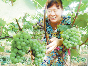 扶沟县韭园镇葡萄合作社种植的50亩大棚葡萄,上市早、果肉实、含糖度高,深受广大消费者欢迎。图为一群众正在采摘成熟的葡萄。(谷志方 摄)