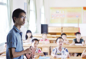 7月31日,在广西钦州市钦南区文峰街道文昌社区,广西利用暑假大学生返乡期间开展“广西大学生志愿服务万村远程教育行动”。图为返乡大学生志愿者凌忠强在教孩子们朗读古诗。 新华社记者 周华 摄