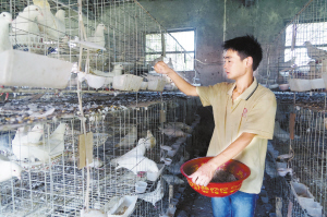 项城市永丰镇“90后”小伙田海伟高考落榜后没有灰心沮丧,多次赴外地考察学习养殖肉鸽技术,创办了肉鸽养殖场,利用3年时间,发展肉鸽1.2万只,年收入20万元左右。(蒋树保 摄)