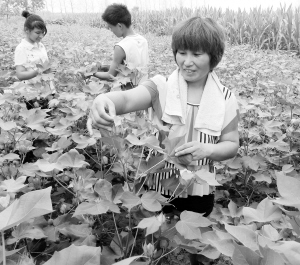 商水县采取“废闲地块+零星地块+麦棉套”、“计生协+基地+棉农”的形式种植优质棉花11300余亩,亩产值达2000元左右,有效促进了农业增效农民增收。图为该县棉农整枝打杈的情景。(赵永昌 摄)
