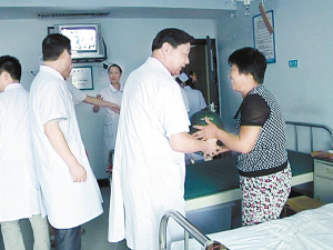 为解决瓜农卖瓜难题,近日,周口协和骨科医院医护人员到扶沟县瓜农家中,购买近2万斤西瓜,分发给医院患者。图为院长刁庆勋给患者分发西瓜。记者 史书杰 摄