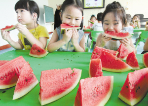 8月6日,幼儿园的小朋友在吃西瓜“啃秋”,迎接立秋的到来。二十四节气中的“立秋”将至,我国民间有立秋之日“啃秋”的习俗,以表达“啃下酷夏、迎接秋爽”的祈愿。(新华社发)