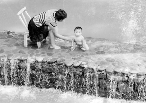 图① 8月11日,在河南省洛阳市的一个风景区,一名游客在河道中给孩子冲凉降温。本周末,河南省持续高温闷热天气。