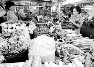 图② 8月11日,一些顾客在上海市宁夏路附近的一家室内菜场选购蔬菜。上海连续多日高温,给蔬菜储存和运输带来不便,菜价也不同程度上涨。