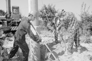 8月7日,扶沟县电业局员工冒着高温紧张施工,架设5.5千米35千伏崔五线,此线路的建成,可将廉岗、常营两座110千伏变电站进行环网,实现线路经济、可靠运行。(记者 王泉林 通讯员 刘滨 刘军胜 摄)