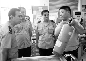 为规范市场经营秩序,切实做好安全生产监督管理,最大限度消除安全隐患,8月5日,扶沟县工商局联合该县公安消防大队开展了消防安全大检查。图为联合执法人员正在对一商场检查。