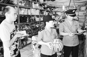 7月中旬以来,市工商局荷花市场分局组织执法人员对辖区青少年体育用品经营店进行检查,严查经销假冒伪劣商品的行为,确保学生体育用品消费市场安全有序。图为执法人员在检查体育用品。