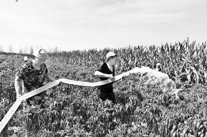 昨日,商水县袁老乡群众在给玉米浇水。由于近期干旱少雨,商水县100多万亩秋作物受旱。该县农业、水利、科技等部门统一组织、合理调度,全力以赴抗旱保秋,再夺秋粮丰收。(刘飞 魏红 摄)