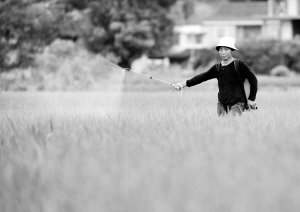 旱情当前,江西省抚州市南丰县发动当地群众通过打井、抽水、引灌等方式进行生产自救。据南丰县宣传部门介绍,受持续旱情影响,目前南丰县116万余亩农作物中有60万亩受旱。图为南丰县白舍镇河东村50岁的村民方木兰在引水灌溉后给晚稻田打药。新华社记者 周科 摄