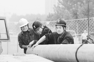 8月18日,郸城县电业局对存在运行安全隐患的郸新35KV线路进行检修,确保电力客户的正常供电。图为工作人员在搬运线杆。(刘兴刚 摄)