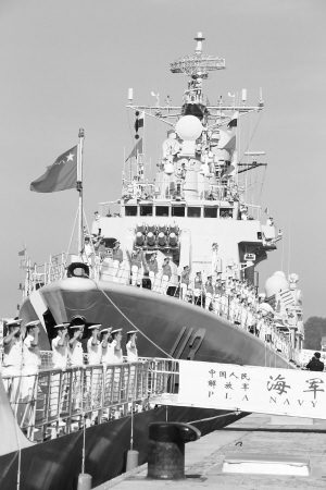 我海军舰艇编队出访美、澳、新三国 8月20日,即将出征的临沂舰、青岛舰官兵在甲板上分区列队。当日,由海军北海舰队导弹驱逐舰青岛舰、导弹护卫舰临沂舰和综合补给舰洪泽湖舰组成的舰艇编队,踏上了访问美国、澳大利亚、新西兰三国的航程。出访编队携带直升机1架,随舰出访官兵680余人,出访总航程将达16000余海里。
