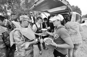 图③:抗洪一线的“暖心”午饭 在逊克县堤防干岔子段,马春玲(右二)和同村妇女为一线抗洪村民送来午饭(8月18日摄)。在黑龙江逊克县堤坝干岔子段抗洪一线,每天中午都有一辆“餐车”给干岔子乡明星村的30多名一线抗洪村民送饭。“有鱼、有肉”的午饭是明星村妇女主任马春玲组织全村十多名妇女自发准备的。