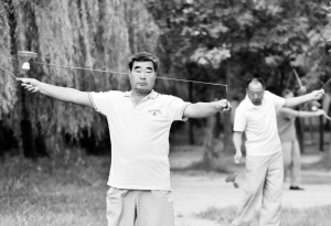 左下图:昨日清晨,几名老人在滨河公园练习抖空竹。空竹,是中国民族文化苑中一株灿烂的花朵。空竹古称“胡敲”,也叫“地铃”、“空钟”、“风葫芦”, 抖空竹亦称“抖嗡”、“抖地铃”、“扯铃”。现流行于全国各地,是一种非常有益的健身运动。(记者  沈湛 摄)