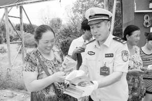 在学校开学前夕,市公安局金海路派出所交管巡防大队民警对学校周边的治安、交通环境进行全面检查和整治,全力维护校园安全。图为8月22日上午民警向群众发放交通安全宣传资料。
