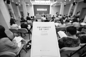 这是《中国与非洲的经贸合作(2013)》白皮书(8月29日摄)。8月29日,国务院新闻办公室在北京举行新闻发布会,发布题为《中国与非洲的经贸合作(2013)》的白皮书,全面介绍了近年来中国与非洲国家在经贸合作方面取得的最新进展。商务部副部长李金早、西亚非洲司司长钟曼英在发布会上介绍白皮书的有关情况,并回答记者提问。新华社记者 李鑫 摄