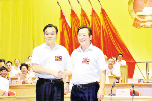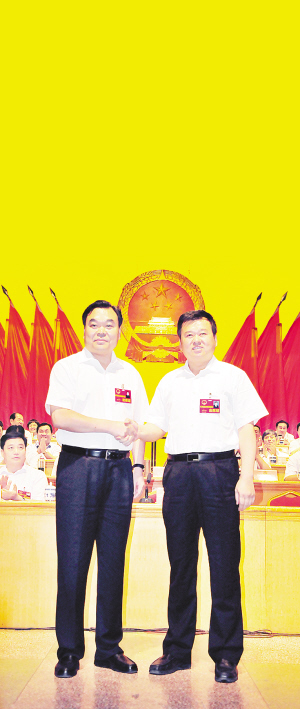 左图二 刘继标当选市长后,市人大常委会主任李洪民与刘继标亲切握手。(记者 戚勇 王亚辉 摄)