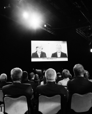 德国总理候选人举行议会选举前辩论 9月1日,在德国柏林的一处媒体中心,观众在观看总理候选人选前电视辩论。当日,德国总理默克尔与德国社会民主党总理候选人佩尔·施泰因布吕克举行选前电视辩论,阐述各自的竞选主张。德国第18届联邦议会选举将于9月22日举行。新华社发