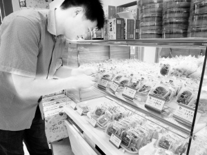 随着廉洁过“双节”理念的逐步深入,今年中秋节市场上推出的纸包月饼或简易包装的月饼受到消费者青睐。图为一位顾客正在挑选简易包装月饼。(记者 孙安平 摄)