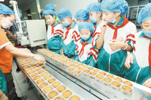 古槐街小学的学生们在了解月饼包装过程。中秋佳节将至,河南省许昌市古槐街小学组织部分学生来到当地一家食品加工企业参加“学做中秋月饼,体验传统文化”活动,同学们在面点师的指导下学习做月饼,感受传统节日文化。( 新华社发)
