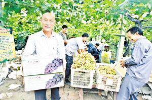 昨日,商水县绿苑合作社的果农正在把葡萄装箱、外运。金秋时节,瓜果飘香,该县种植的3600亩无公害葡萄喜获丰收。(刘飞 魏红 摄 )