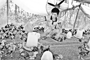 9月15日,商水县袁老乡凡庄村返乡农民工刘庆丰在给小柴鸡添加食料。 今年以来,该县3000余名返乡农民工在农业、科技、畜牧等部门的帮助指导下,在家门口实现了再就业、创业致富。