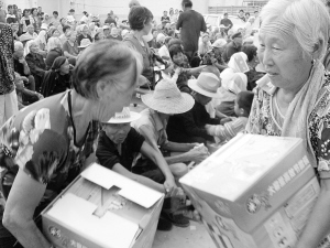 中秋节前,商水县魏集镇商会向农村困难户发放“中秋节大礼包”,让他们感到节日的幸福、温馨和甜蜜。图为困难户正在领取中秋节礼品的情形。